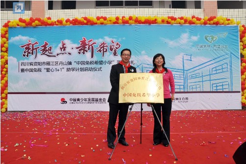 2010年10月11日上午,位于四川省資陽市雁江區(qū)丹山鎮(zhèn)牌坊村的中國免稅希望小學(xué)里喜氣洋洋、熱鬧非凡。特意從北京趕來的中國青少年發(fā)展基金會的汪 敏副秘書長、馮敏慧部長,中免集團(tuán)盧路總裁和四川省市兩地的領(lǐng)導(dǎo)與全校近兩百名師生一起為新落成的“資陽市雁江區(qū)丹山鎮(zhèn)中國免稅希望小學(xué)”舉行了隆重的落 成典禮。