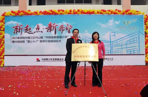 2010年10月11日上午,位于四川省資陽市雁江區(qū)丹山鎮(zhèn)牌坊村的中國免稅希望小學(xué)里喜氣洋洋、熱鬧非凡。特意從北京趕來的中國青少年發(fā)展基金會的汪敏副秘書長、馮敏慧部長,中免集團(tuán)盧路總裁和四川省市兩地的領(lǐng)導(dǎo)與全校近兩百名師生一起為新落成的“資陽市雁江區(qū)丹山鎮(zhèn)中國免稅希望小學(xué)”舉行了隆重的落成典禮。