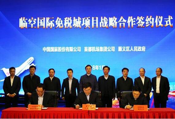 1月12日,中國國旅股份有限公司、首都機(jī)場(chǎng)集團(tuán)、順義區(qū)三方在京舉行臨空國際免稅城項(xiàng)目戰(zhàn)略合作框架協(xié)議簽約儀式。中國旅游集團(tuán)副總經(jīng)理、國旅股份公司董事長李剛,首都機(jī)場(chǎng)集團(tuán)公司總經(jīng)理、黨委副書記劉雪松,北京市順義區(qū)委書記王剛出席簽約儀式,國旅股份公司總經(jīng)理彭輝、首都機(jī)場(chǎng)集團(tuán)黨委書記、副總經(jīng)理宋勝利與順義區(qū)區(qū)委常委、副區(qū)長初軍威代表三方在協(xié)議上簽字。