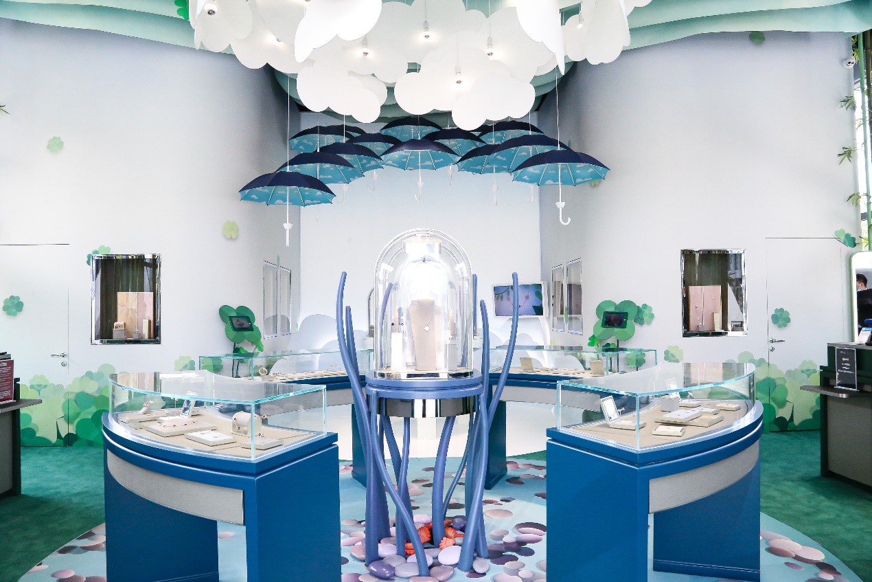 Van Cleef & Arpels梵克雅寶“Alhambra幸運花園”免稅限時精品店位于三亞國際免稅城后廣場。世家要員雅克·雅寶Jacques Arpels常言道:“心懷幸運之愿,方能成為幸運之士?!毙疫\是梵克雅寶一直以來十分珍視的價值,更是其創(chuàng)意靈感的泉源之一,因此限時精品店內(nèi)部設計以世家標志性四葉幸運圖案為主題,以延續(xù)這珍貴價值。進店后,首先映入訪客眼簾的將是Burcu & Geoffrey 這對法國和土耳其的導演拍檔為Alhambra 特別創(chuàng)作的四葉圖騰造型蝴蝶沿途散播幸運的種子,帶領(lǐng)游客穿梭在幸運花園中,引領(lǐng)大眾一同探索夢幻迷人的Alhambra 幸運花園, 為游客營造出一種舒適愉快的珠寶欣賞空間。
