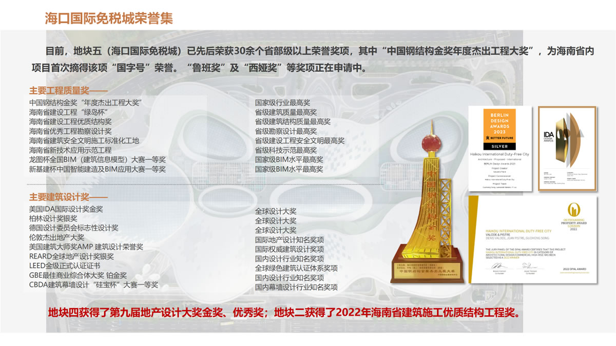 ▲ 海口國(guó)際免稅城項(xiàng)目整體建設(shè)所獲榮譽(yù)